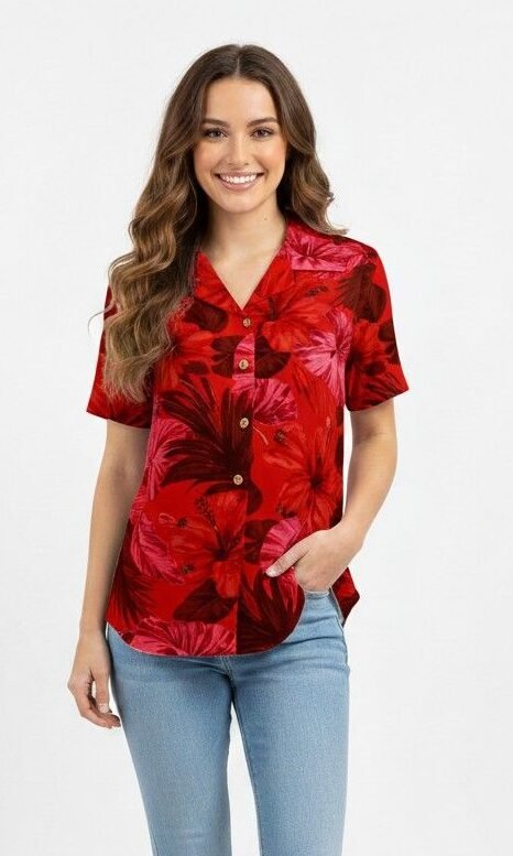 / Women’s red floral short-sleeve button-upcHawaii shirt