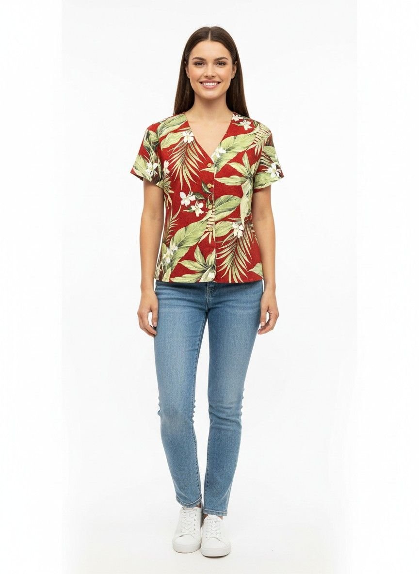 / Women’s Red Tropical Leaf Print Short-Sleeve Button-Up Hawaii Shirt